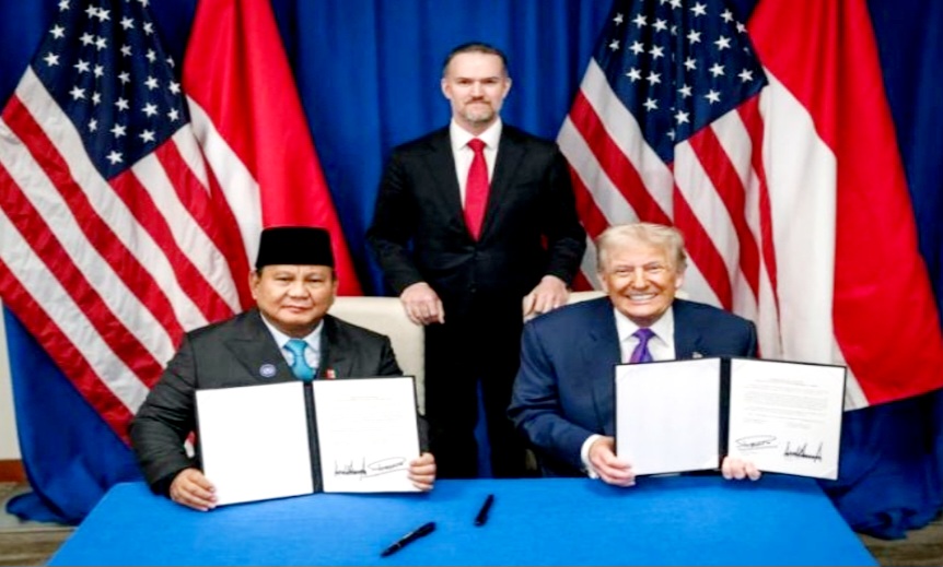 Presiden RI Prabowo Subianto (kiri) dan Presiden Amerika Serikat Donald Trump (kanan) mendatangani perjanjian perdagangan timbal balik di Washington DC,...
