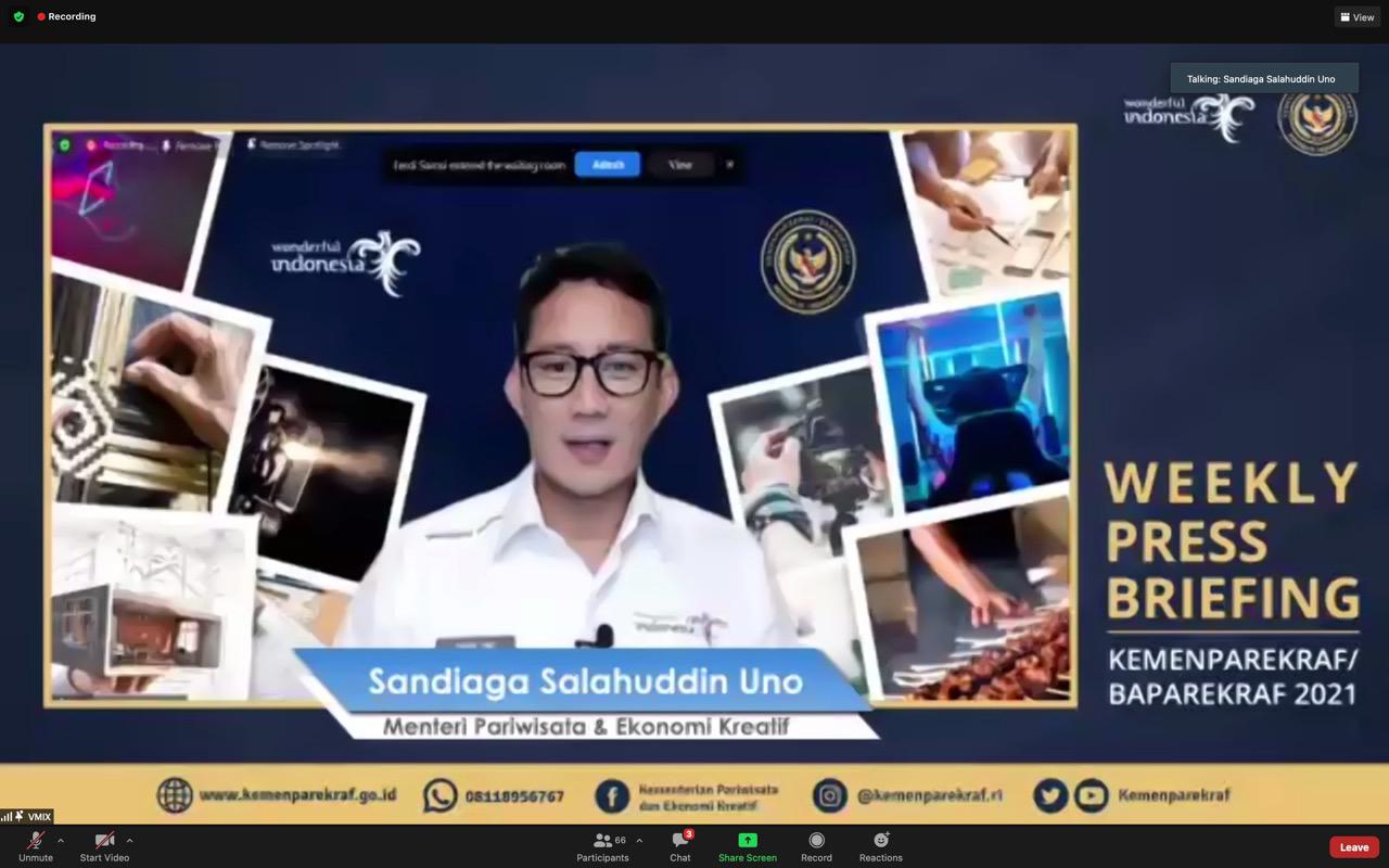 “Program ini sudah dirancang dengan baik sejak lama. Ini adalah pilihan, ditunda atau dijalankan dengan adaptasi. Adaptasi ini yang saya ambil sebagai langkah untuk memastikan pemulihan ekonomi kita tidak tertunda. Bahwa kita tidak akan sepenuhnya hadir secara fisik, tapi hybrid,” kata Menparekraf Sandiaga Uno.
